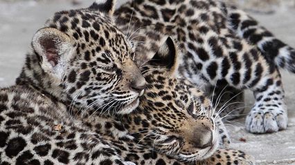 Dwie samiczki jaguara przyszły na świat w krakowskim ogrodzie zoologicznym 7 czerwca. Pierwsze tygodnie spędziły w pomieszczeniu, teraz już pod opieką mamy Bili wychodzą na pierwsze spacery po wybiegu.