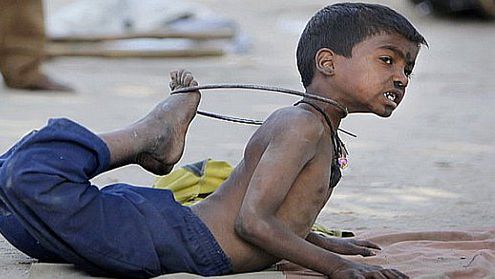 Młody Nepalczyk prezentuje swoje umiejętności przeciskając się przez metalową obręcz.
