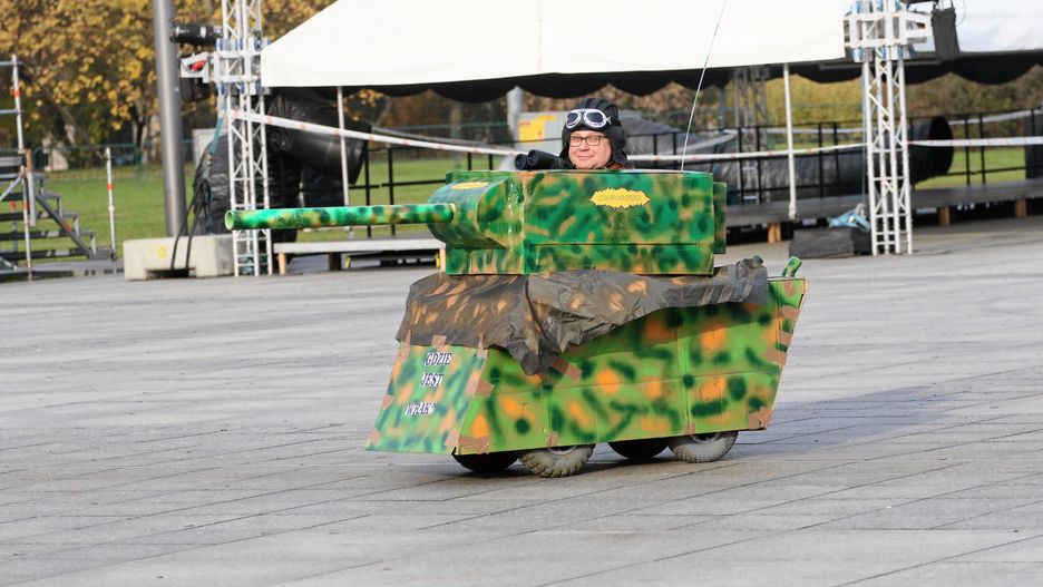 Mężczyzna porusza się na elektrycznym wózku inwalidzkim. Nałożył na niego konstrukcję z kartonu przypominającą czołg. – Nie spodziewałem się, że czołg z pudełka wywoła aż taki popłoch. Ktoś nam zrobił zdjęcie i opublikował w internecie. Wtedy do akcji włączyli się najważniejsi politycy PiS. Ta władza boi się zwykłej satyry. Nie doszło do żadnego znieważenia. Nikt się nie śmiał, nikt nie przeszkadzał ani żołnierzom, ani uczestnikom miesięcznicy – mówi Leszek Piątkowski.