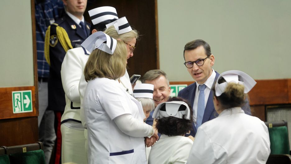 "Premier Mateusz Morawiecki przyszedł na sejmową galerię powiedzieć pielęgniarkom, że popiera ich postulaty. Być może nie słuchał wystąpienia Krystyny Ptok, że to jego ekipa zamroziła te postulaty w poprzedniej kadencji" - poinformował na Twitterze Klaudiusz Slezak, dziennikarz Radia Nowy Świat.