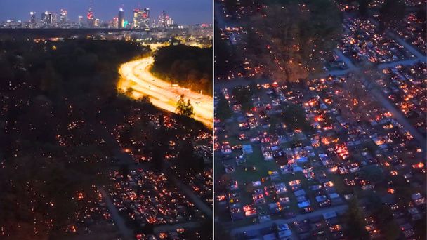 Na nagraniu PAP widać rozświetlony tysiącami zniczy cmentarz na warszawskich Powązkach. Migoczące światła stworzyły magiczny obraz. W tle można też zauważyć panoramę Warszawy. Wszystko samo w sobie idealnie oddaje atmosferę dnia Wszystkich Świętych, gdzie jesienny mrok przysłoniło morze świateł.