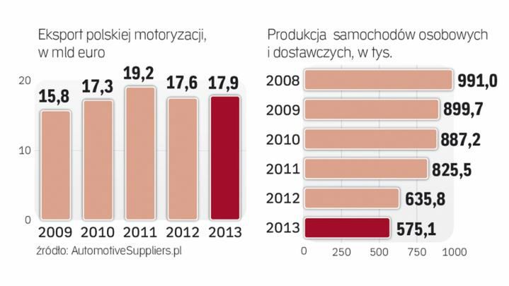Choć przemysł samochodowy to jeden z kluczowych sektorów polskiej gospodarki, jego udział w globalnej produkcji branży słabnie. W 2013 roku w Polsce wytwarzano 0,7 proc. światowej produkcji motoryzacyjnej, co w globalnym rankingu dawało nam 24. miejsce. To znacznie gorszy wynik niż przed kryzysem: w roku 2007 było to jeszcze 1,1 proc. produkcji i 20. pozycja. W ubiegłym roku polskie fabryki wyprodukowały zaledwie 475 tys. aut osobowych, podczas gdy w 2008 roku było to niemal dwa razy więcej.