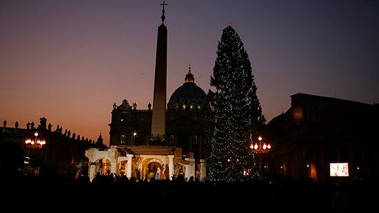 Na Placu świętego Piotra w Watykanie została odsłonięta o zmierzchu w Wigilię tradycyjna szopka, która jest tam ustawiana od 1982 roku. Większość figur w ogromnej szopce o powierzchni kilkuset metrów kwadratowych pochodzi z połowy XIX wieku z rzymskiego kościoła Sant Andrea della Valle.