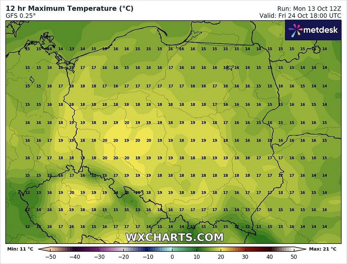 Pierwsza fala ocieplenia nadejdzie w środę, 22 października. Tego dnia - jak wynika z map IMGW - w wielu regionach kraju słupki rtęci poszybują w górę, osiągając od 14 do nawet 18 st. C. Ciepła aura utrzyma się również w czwartek, 23 października, z temperaturami w przedziale 13-17 stopni.