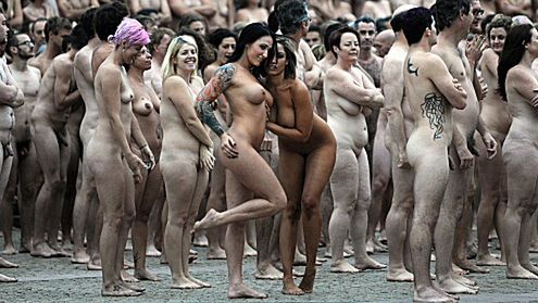 - Niech wszystkie pary przytulą się i pocałują, przyjaciele też niech się pocałują, a obcy niech robią co chcą - instruował zebranych artysta, który słynie z fotografowania skupisk nagich ludzi w miejscach publicznych.
