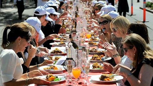 Ludzie od zawsze uwielbiali jeść i pić. Dlatego w Melbourne (Australia) zorganizowano wydarzenie pod nazwą "Najdłuższy Lunch Świata". Punktualnie o godzinie 18.00 pół tysiąca smakoszy zasiadło do 400 metrowego stołu. To się nazywa uczta…