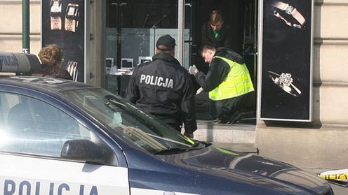 Policja zabezpiecza ślady w obrabowanym sklepie jubilerskim w Krakowie. Sprawca drewnianą pałką rozbił szybę wystawową i ukradł wyeksponowaną biżuterię.