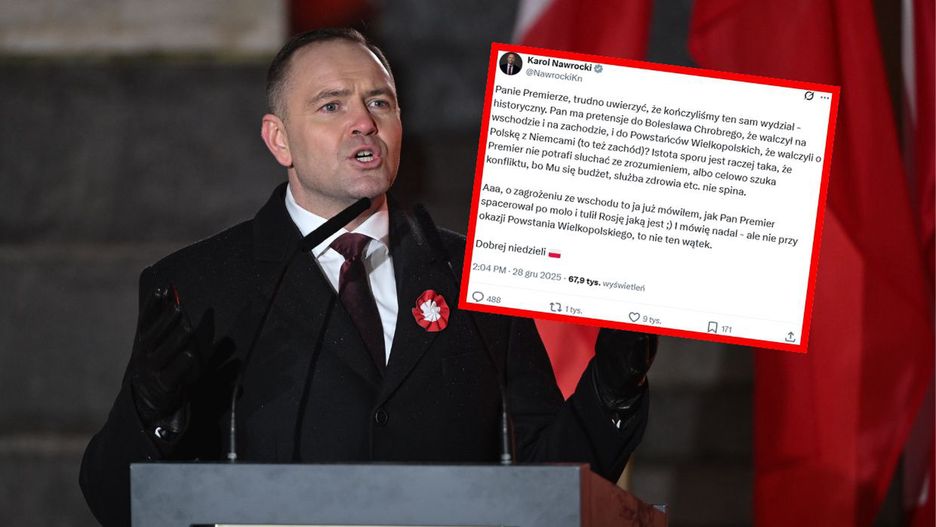 "Panie Premierze, trudno uwierzyć, że kończyliśmy ten sam wydział - historyczny. Pan ma pretensje do Bolesława Chrobrego, że walczył na wschodzie i na zachodzie, i do Powstańców Wielkopolskich, że walczyli o Polskę z Niemcami (to też zachód)? Istota sporu jest raczej taka, że Premier nie potrafi słuchać ze zrozumieniem, albo celowo szuka konfliktu, bo Mu się budżet, służba zdrowia etc. nie spina" - napisał w serwisie X Karol Nawrocki.