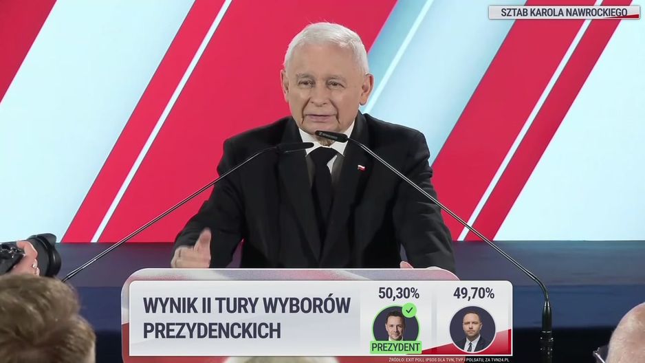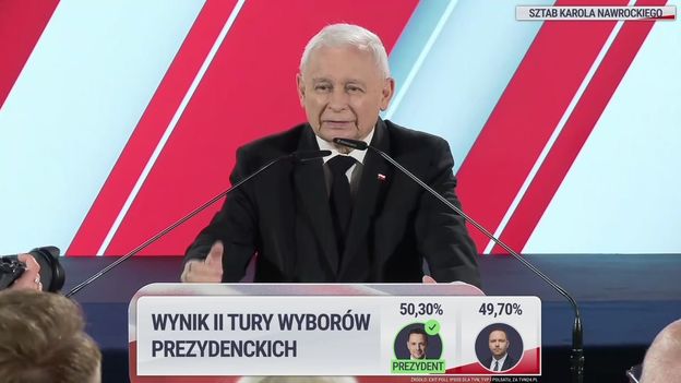 - Wygramy te wybory, a miarą tego zwycięstwa jest relacja sił. Ogromna przewaga medialna, finansowa, wsparcie z zewnątrz i ta Niagara kłamstw i to takich zupełnie najgorszych, najbardziej obrzydliwych, najbardziej odrażających. Wydawało się, że w tej sytuacji nic się nie da zrobić. Dało się i za to bardzo dziękuję przede wszystkim Karolowi Nawrockiemu – powiedział prezes PiS Jarosław Kaczyński, komentując pierwsze sondażowe wyniki wyborów prezydenckich. Tłum skandował w tym czasie hasło "wygraliśmy". - Tak, proszę państwa, wygraliśmy, dlatego, że mamy rację i mówimy prawdę o Polsce. Prawdę o tym wszystkim, co jest w naszym kraju dzisiaj złe i bardzo złe. Prawdę o tej drodze, która jest w tej chwili wyznaczana z zewnątrz, a którą prowadzi nas Donald Tusk. To jest droga dokładnie przeciwna temu, czego nasz naród potrzebuje, dokładnie przeciwna naszym interesom – powiedział Kaczyński. Z badania exit poll zrealizowanego przez IPSOS dla stacji TVN, Polsat i TVP wynika, że to Rafał Trzaskowski wygrał II turę wyborów prezydenckich w Polsce. Pierwsze sondażowe wyniki wskazują, że kandydat KO uzyskał 50,3 proc. głosów. Na Karola Nawrockiego zagłosowało natomiast 49,7 proc. wyborców.