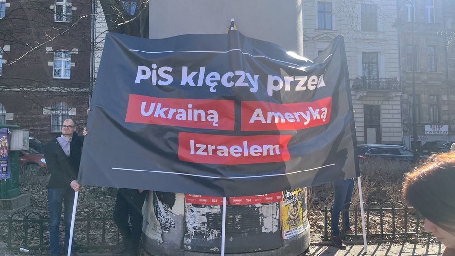 Demonstrujący przynieśli ze sobą sporych rozmiarów baner. "PiS klęczy przed Ukrainą, Ameryką, Izraelem" - można na nim przeczytać.