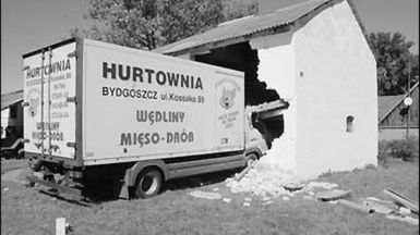 W ubiegły piątek, nad ranem, rodzinę Wontorczyków, (którzy mieszkają kilkadziesiąt metrów dalej, również przy szosie) zerwał z łóżek potężny łoskot. Mercedes - chłodnia „wyprostował” zakręt, przejechał przez żywopłot i z impetem wpadł na podwórze. Zatrzymał się w bramie murowanego warsztatu. Chłodnia jechała od strony Miastka. Jej kierowca cudem przeżył. W każdej chwili mógł runąć popękany budynek.