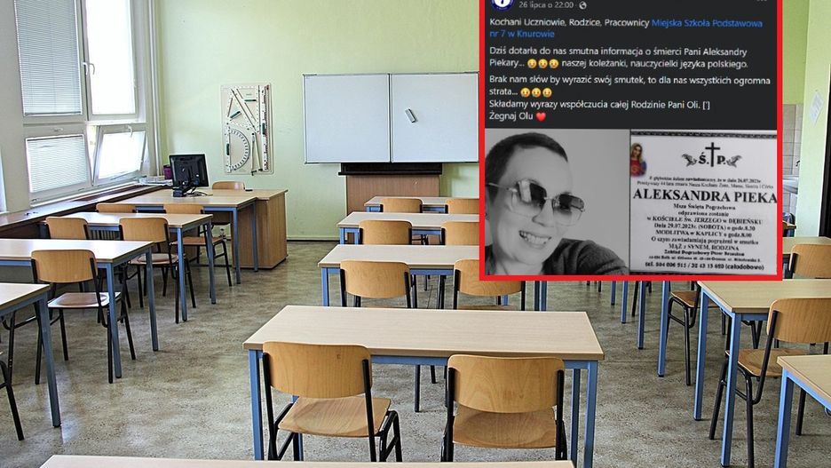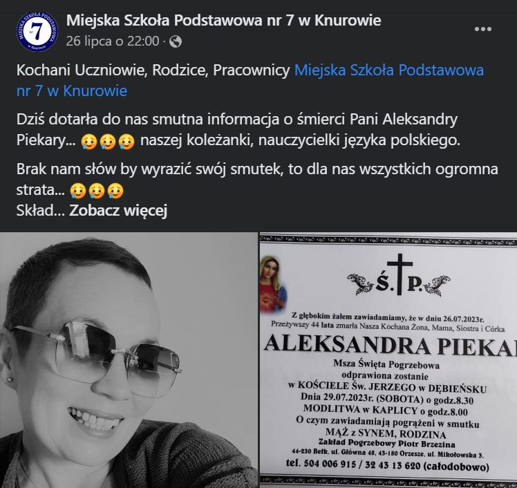 "Kochani Uczniowie, Rodzice, Pracownicy Miejskiej Szkoły Podstawowej nr 7 w Knurowie. Dziś dotarła do nas smutna informacja o śmierci Pani Aleksandry Piekary... naszej koleżanki, nauczycielki języka polskiego" - czytamy we wpisie.