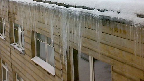 Sople zwisające z gzymsu i czapy śniegu zalegające na skraju dachu mogą runąć na nieświadomych zagrożenia przechodniów