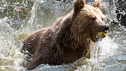 Niedźwiedzie z wrocławskiego zoo łowią jabłka w sadzawce na wybiegu, podczas upalnego poranka. O tej porze roku, to ich ulubiona zabawa.