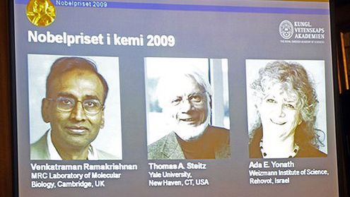 Ada E. Yonath z Izraela, Venkatraman Ramakrishnan - Amerykanin pracujący w Wielkiej Brytanii oraz Thomas A. Steitz z USA otrzymali Nagrody Nobla 2009 z chemii za "badania nad procesami kluczowymi dla życia". Naukowcy wyjaśnili, jak wygląda rybosom i jak funkcjonuje na poziomie atomów. Rybosomy są strukturami kluczowymi dla życia, przekładają bowiem informację genetyczną zawartą w DNA na białka tworzące komórki żywych organizmów. Na zdjęciu Ada Yonath. Ada E. Yonath urodziła się w 1939 r. w Jerozolimie w Izraelu. Jest pracownikiem Naukowego Instytutu Weizmanna w Rehovot w Izraelu.