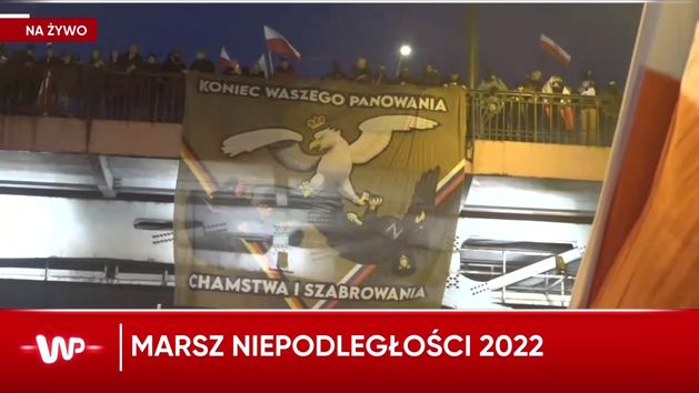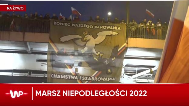 Hasło: "Koniec waszego panowania, chamstwa i szabrowania", a poniżej grafika z białym orłem oraz dwoma czarnymi i wstęgami w barwach flag Niemiec i Rosji - taki baner działacze Młodzieży Wszechpolskiej wywiesili z mostu Poniatowskiego podczas Marszu Niepodległości. - Mogę tylko interpretować, że chodzi tutaj o Polskę. I jest to nawiązanie do słów ministra sprawiedliwości Zbigniewa Ziobry, który w jednym rzędzie zestawiał Niemcy i Rosję, jeśli chodzi o zagrożenie dla polskiej niepodległości - relacjonował z trasy marszu Patryk Michalski. Reporter Wirtualnej Polski zauważył, że nasi zachodni sąsiedzi to członkowie zarówno NATO, jak i Unii Europejskiej, więc taki plakat musi wywołać szerokie komentarze. Przypomnijmy: na banerach przyniesionych przez uczestników było też kilka haseł antyukraińskich i uderzających w osoby LGBT.