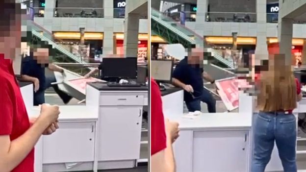 Niecodzienne obrazki w Złotych Tarasach w Warszawie. Policja udostępniła nagranie świadka, który zarejestrował napaść ochroniarza na jednego z klientów. Jak wyjaśnili funkcjonariusze, mężczyzna wpadł w szał po tym, jak klient chciał złożyć na niego skargę. Chwycił wówczas za baner reklamowy i zaczął nim wymachiwać, kilkukrotnie uderzając spokojnie stojącego przy ladzie mężczyznę. Wszystko zacząć miało się od sprzeczki słownej w jednym ze sklepów z elektroniką na terenie centrum handlowego, ale wydarzenia potoczyły się na tyle źle dla ochroniarza, że ten skończył w areszcie. Agresorem okazał się być 55-letni obywatel Gruzji. "Na miejsce przybyli policjanci z Wydziału Wywiadowczo-Patrolowego śródmiejskiej komendy. Zatrzymali agresywnego pracownika ochrony, okazał się nim 55-letni obywatel Gruzji. Został on przewieziony do komendy, gdzie po nocy spędzonej w celi przeprowadzono z nim dalsze czynności. Mężczyzna usłyszał trzy zarzuty, w tym naruszenia czynności narządu ciała powodując rozstrój zdrowia trwający poniżej 7 dni. Dodatkowo usłyszał zarzuty związane z kierowaniem gróźb oraz znieważenia obywatela Polski z powodu jego przynależności narodowej. 45-letni klient sklepu został przewieziony do szpitala. W wyniku tego zdarzenia doznał niegroźnych obrażeń głowy" - wyjaśniła sprawę stołeczna policja.