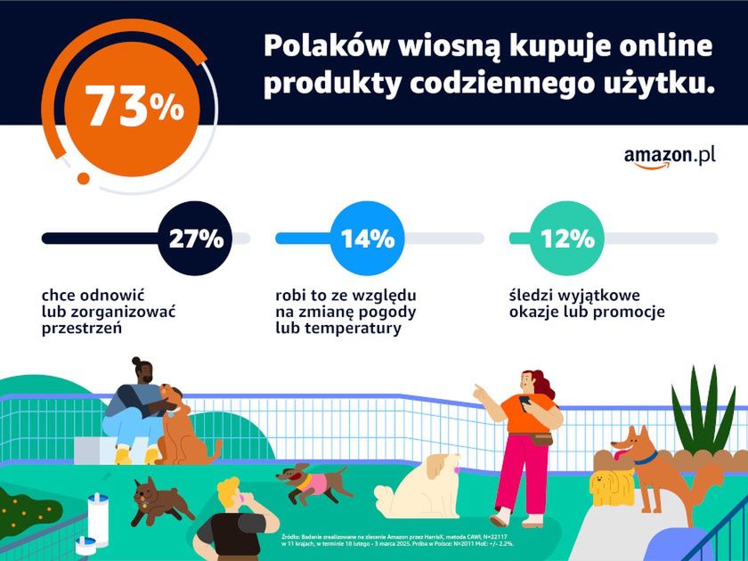 - Z badania przeprowadzonego przez HarrisX dla Amazon.pl wynika, że 73% Polaków kupujących online szuka wiosną w sklepach internetowych artykułów codziennego użytku, głównie odzieży, obuwia, kosmetyków i środków czystości.