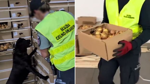 Ciężarówka z ładunkiem cebuli przyjechała z Mołdawii i została zatrzymana do szczegółowej kontroli przez funkcjonariuszy podlaskiej KAS. Nagranie z finału całej akcji udostępniła Krajowa Administracja Skarbowa. Widać na nim, jak ciężarówka w asyście mundurowych wjechała do jednego z magazynów kontrolnych, gdzie przeprowadzono dokładne przeszukanie towaru w naczepie z wykorzystaniem psa. Okazało się, że w kartonach z cebulą ukryte były nielegalne paczki papierosów.