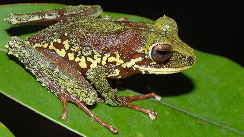 Żółty płaz z rodziny rzekotkowatych żyje na drzewach rosnących wzdłuż małych strumieni w lasach deszczowych.