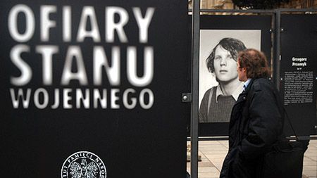 1 / 8Z okazji 26. rocznicy wprowadzenia w Polsce stanu wojennego IPN przygotował przy ul. Krakowskie Przedmieście 30 w Warszawie wystawę zdjęć. Zaprezentowano na niej 56 zdjęć i biogramów przedstawiających osoby zmarłe i zamordowane po 13 grudnia 1981 roku.