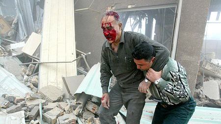 4-letni ranny chłopczyk w szpitalu Nur w Bagdadzie. Co najmniej 55 osób zginęło, a 47 zostało rannych wskutek eksplozji dwóch amerykańskich rakiet manewrujących na bagdadzkim bazarze Bagdad. Specjalnie dla kamerzystów, na życzenie ojca iracki chłopczyk pozuje w hełmie i z załadowanym kałasznikowem ojca