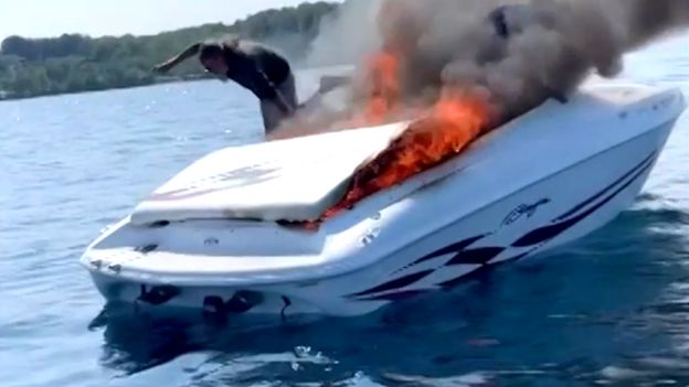 Mrożące krew w żyłach nagranie z USA. Para podróżująca motorówką przeżyła koszmar podczas urlopu. Gdy pływali po zatoce West Grand Traverse Bay w pobliżu Traverse w stanie Michigan, nagle na ich łodzi pojawił się ogień. Tuż za bohaterami nagrania płynęło małżeństwo. Świadkowie natychmiast zaczęli krzyczeć, by poszkodowani skoczyli do wody. Agencja Ruetera udostępniła nagranie żony Nathana Greenwooda, która zarejestrowała niebezpieczny moment w wodach jeziora Michigan. Na nagraniu można zauważyć, że właściciel płonącej motorówki starał się jeszcze ugasić pożar. Żywioł jednak nie dawał za wygraną i para uratowała się w ostatniej chwili przed wybuchem zbiornika z paliwem. Greenwoodom udało się bezpiecznie wyciągnąć poszkodowanych żeglarzy z wody. Na miejsce przybyła łódź ratunkowa, która dogaszała pożar. Według lokalnych doniesień, ostatecznie łódź motorowa zatonęła.