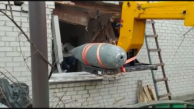 Ratownicy Państwowej Służby Ukrainy ds. Sytuacji Nadzwyczajnych udostępnili nagranie ogromnego niewybuchu, który został wyciągnięty w niedzielę (13 marca) z jednego z domów w Czernihowie, w północnej Ukrainie. Jest to bomba odłamkowo-burząca OFAB 500 zrzucana z samolotów. Funkcjonariusze poinformowali, że w ciągu jednego dnia udało im się zabezpieczyć aż trzy takie niewybuchy lotnicze. Akcja wymagała niezwykłej precyzji i opanowania. Bomba OFAB 500 waży około 500 kg i posiada materiał wybuchowy o wadze ok. 155 kg. Jest wyposażona w zapalnik elektroniczny, który może być zaprogramowany przed zrzutem. OFAB 500 może eksplodować w powietrzu nad celem i razić odłamkami, może uderzyć bezpośrednio w cel lub być zaprogramowana na wybuch z opóźnieniem.