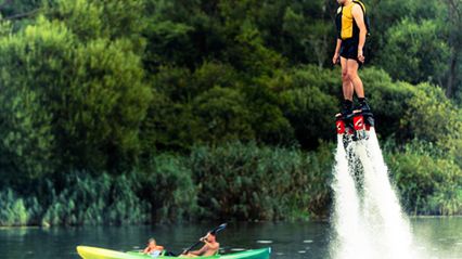 Plażowicze na kąpielisku Dziewoklicz mogli zapoznać się z flyboardingiem - popularnym ostatnio nowym sportem wodnym. Chętnych, nie brakowało.