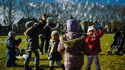 Małymi krokami idzie wiosna. Na Jasnych Błoniach w Szczecinie dzieci bawią się w towarzystwie Bańkoterapeuty, który swoimi mydlanymi marzeniami rozbawia dzieci.