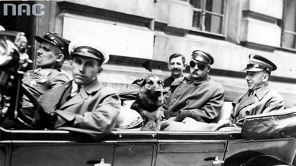 Konrad Zembrzuski (z prawej strony), pułkownik kawalerii Wojska Polskiego. Z lewej Józef Piłsudski. Samochód prowadzi szofer Malinowski, obok niego siedzi chor. Walenty Wójcik, 1929.