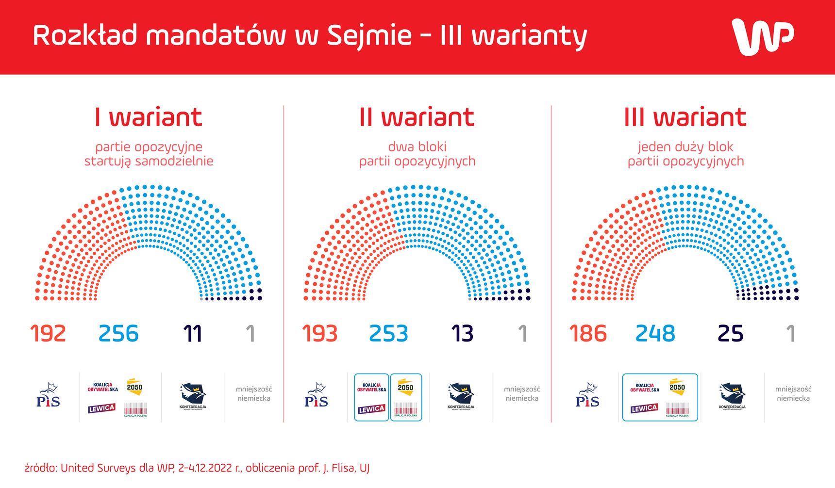 Sondaż United Surveys dla Wirtualnej Polski został przeprowadzony w dniach 2-4 grudnia 2022 roku metodami CAWI & CATI 50/50 na reprezentatywnej grupie tysiąca Polaków. Prognozowany podział mandatów w Sejmie opracował prof. Jarosław Flis.