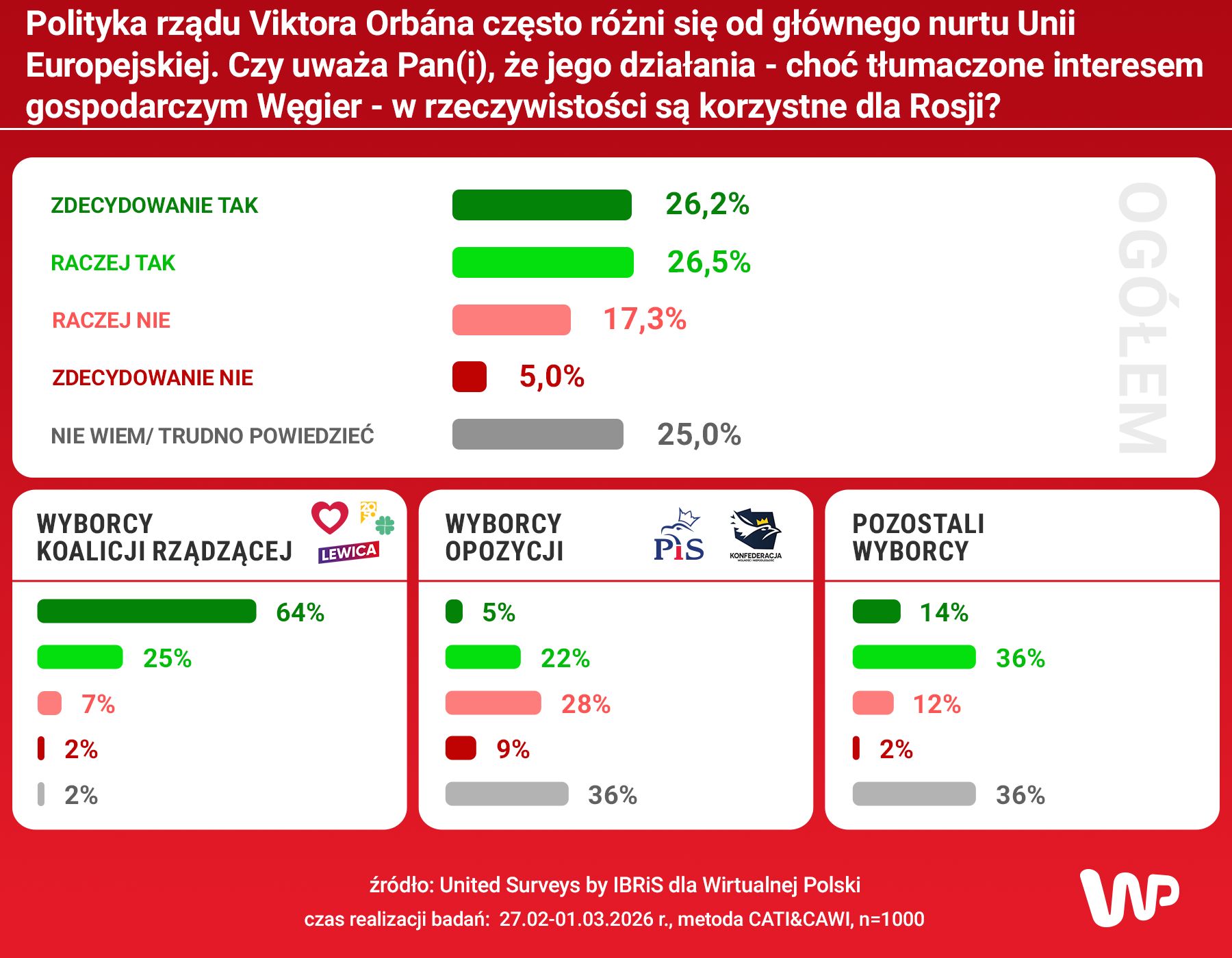Badanie United Surveys by IBRiS dla Wirtualnej Polski przeprowadzono w dniach 27.02-01.03.2026 r., metodą CATI & CAWI (wywiadów telefonicznych wspomaganych komputerowo oraz wywiadów internetowych), na reprezentatywnej grupie n=1000 dorosłych Polaków.