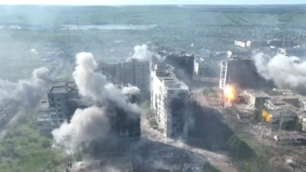 Ciężki ostrzał pozycji wagnerowców w Bachmucie. Ukraińcy przeprowadzili rozeznanie terenu przy użyciu drona i okazało się, że na jednym z opuszczonych osiedli czają się ludzie Prigożyna. Rosjanie ukryli się w blokach, skąd prowadzili nieustanny ostrzał pozycji obrońców. Ukraińcy nie dali jednak za wygraną. Udostępnione przez agencję Reutera nagranie pokazuje ostrzał rosyjskiej pozycji przy pomocy ciężkiej artylerii. Nie byłoby w tym nic dziwnego, gdyby nie fakt, że cała akcja trwała od 8 rano do 19 wieczorem. Przez cały ten czas obrońcy miasta nękali najemników pociskami z moździerzy. Ogień artyleryjski ustał dopiero wieczorem, gdy Ukraińcy mieli pewność, że pozycja Rosjan została opuszczona, lub jej obrońcy zginęli.