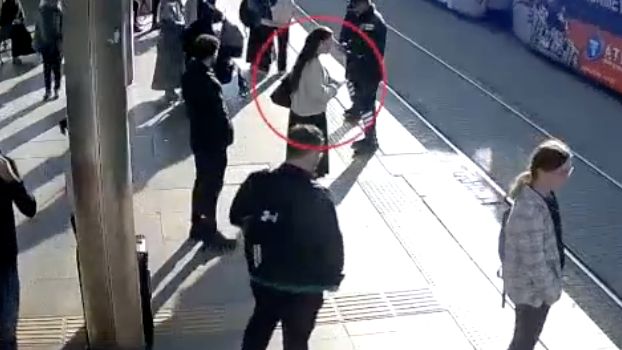 Na nagraniu z kamer monitoringu widać, jak dziewczyna najpierw spokojnie stoi na przystanku tramwajowym. Przegląda telefon, ma na uszach słuchawki.