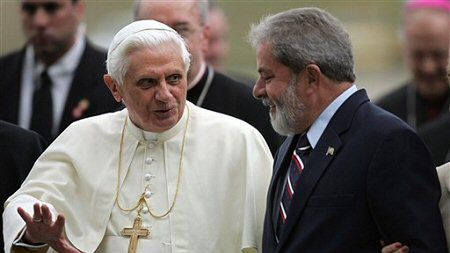 Zwracając się do prezydenta Brazylii, Benedykt XVI podkreślił: Panie prezydencie, wdzięczny jestem Opatrzności Bożej za to, że obdarzyła mnie łaską odwiedzenia Brazylii, kraju o wielkiej katolickiej tradycji.