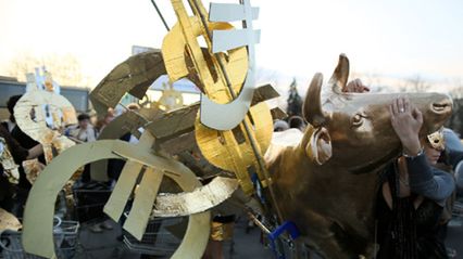 Złoty cielec w asyście wózków sklepowych, dolarów, euro i złotych - tak aktywiści i artyści protestowali przeciwko budowie galerii handlowej. Złota parada to protest przeciwko kulturze promującej konsumpcjonizm kosztem kultury. Bowiem, ab zbudować nową galerię handlową inwestor chce zburzyć znany hotel Cracovia - przykład powojennego modernizmu z cennymi mozaikami. Protestujący mają nadzieję, ze uda się powstrzymać budowę galerii, zachować hotel i wpisać go do rejestru zabytków.