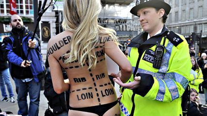 Półnaga modelka szybko została poproszona przez policję o zakrycie swoich piersi.