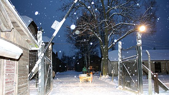 Brama główna w obozie Auschwitz I, jako jedyna w całym obozie, została wykonana na rozkaz Niemców przez polskich więźniów politycznych. Zostali oni przywiezieni jednym z pierwszych transportów przybyłych z Wiśnicza na przełomie 1940-1941 roku. Wykonanie bramy związane było z wymianą prowizorycznego zewnętrznego ogrodzenia obozu, wspartego na słupach drewnianych, na ogrodzenie stałe na słupach żelbetowych, z drutem kolczastym pod napięciem.