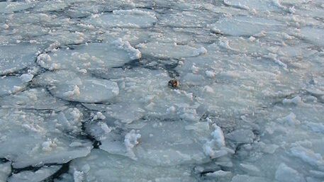 Początkowo podejrzewano, że jest to foka, ale okazało się, że jest to pies wdrapujący się na krę.