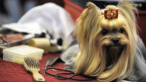 Pies rasy Yorkshire Terrier jest przygotowywany do konkursu podczas imprezy "Pies i Koń" odbywającej się w Dortmundzie.