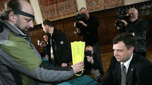 Sopot, 20.03.2009. Piotr Lisiewicz, lider prawicowej grupy happeningowej "Naszość" wręcza prezydentowi Sopotu Jackowi Karnowskiemu płetwę.