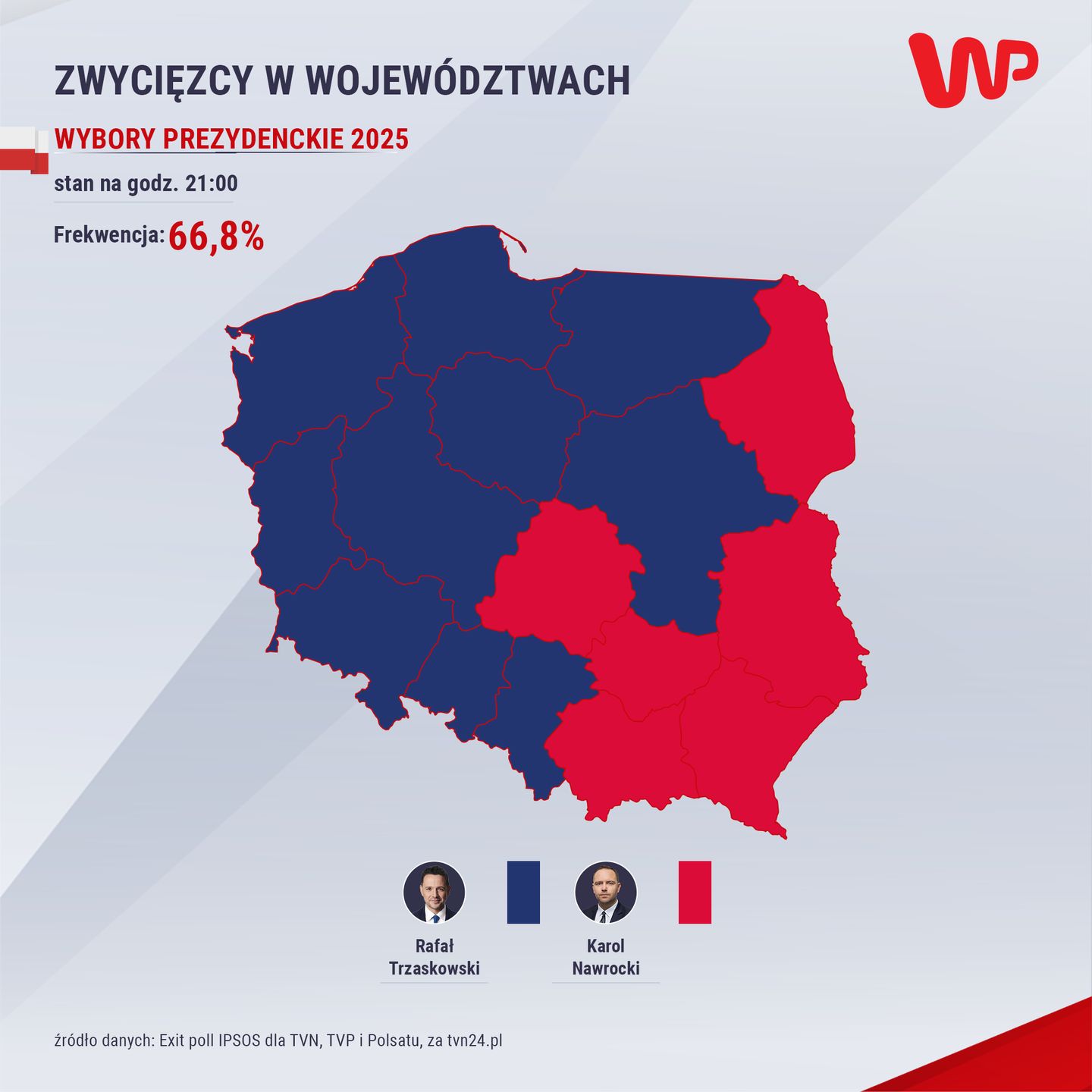 Z badania exit poll przeprowadzonego przez IPSOS wynika, że Rafał Trzaskowski zdobył 30,8 proc. głosów, zaś Karol Nawrocki 29,1 proc. Ostateczne wyniki są zbliżone i potwierdziły nieznaczne zwycięstwo Trzaskowskiego.