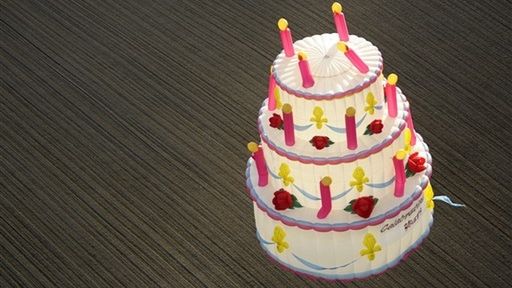 Ozdobą imprezy jest niezwykły balon w kształcie tortu urodzinowego.