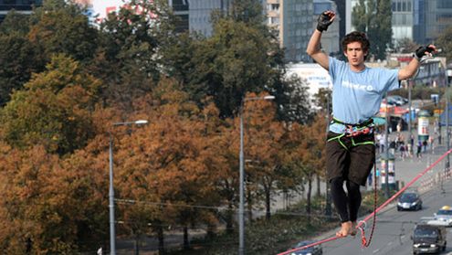 Polscy slacklinerzy Jan Gałek i Damian Czermak dali popis swoich umiejętności w samym centrum Warszawy. Śmiałkowie spacerowali nad głowami przechodniów po taśmie rozpiętej między budynkami domów towarowych Junior i Sawa.