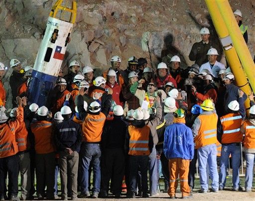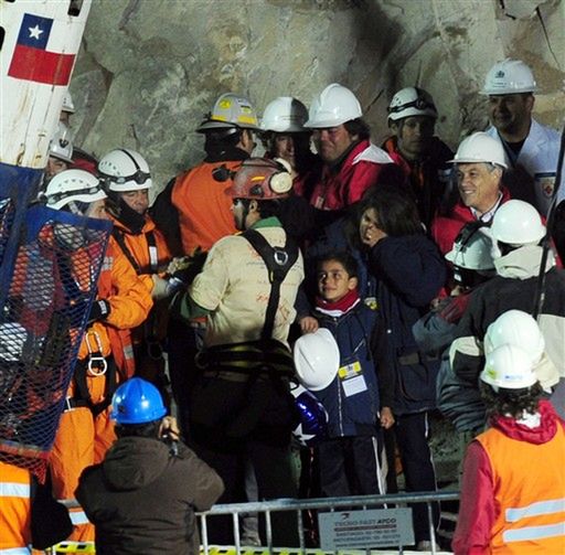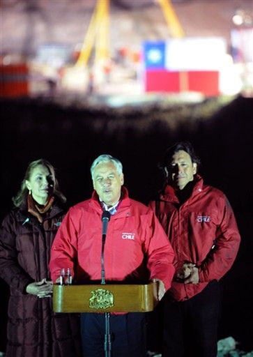 Na zdjęciu: prezydent Chile Sebastian Pinera w towarzystwie żony Cecylii Morel i ministra ds. górnictwa Laurence Golborne kilka minut po tym, jak górnik Florencio Avalos został wyniesiony w kapsule na powierzchnię.