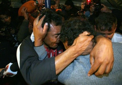 Na zdjęciu: Alfonso Avalos, ojciec chilijskich górników Florencio i Wilsona Avalos, ściska Florencio, który został wydobyty na powierzchnię po tym, jak 10 tygodni spędził w zawalonej kopalni San Jose, w pobliżu Copiapó, 800 km na północ od Santiago w Chile. Avalos był pierwszym z 33 górników, który został wydobyty.