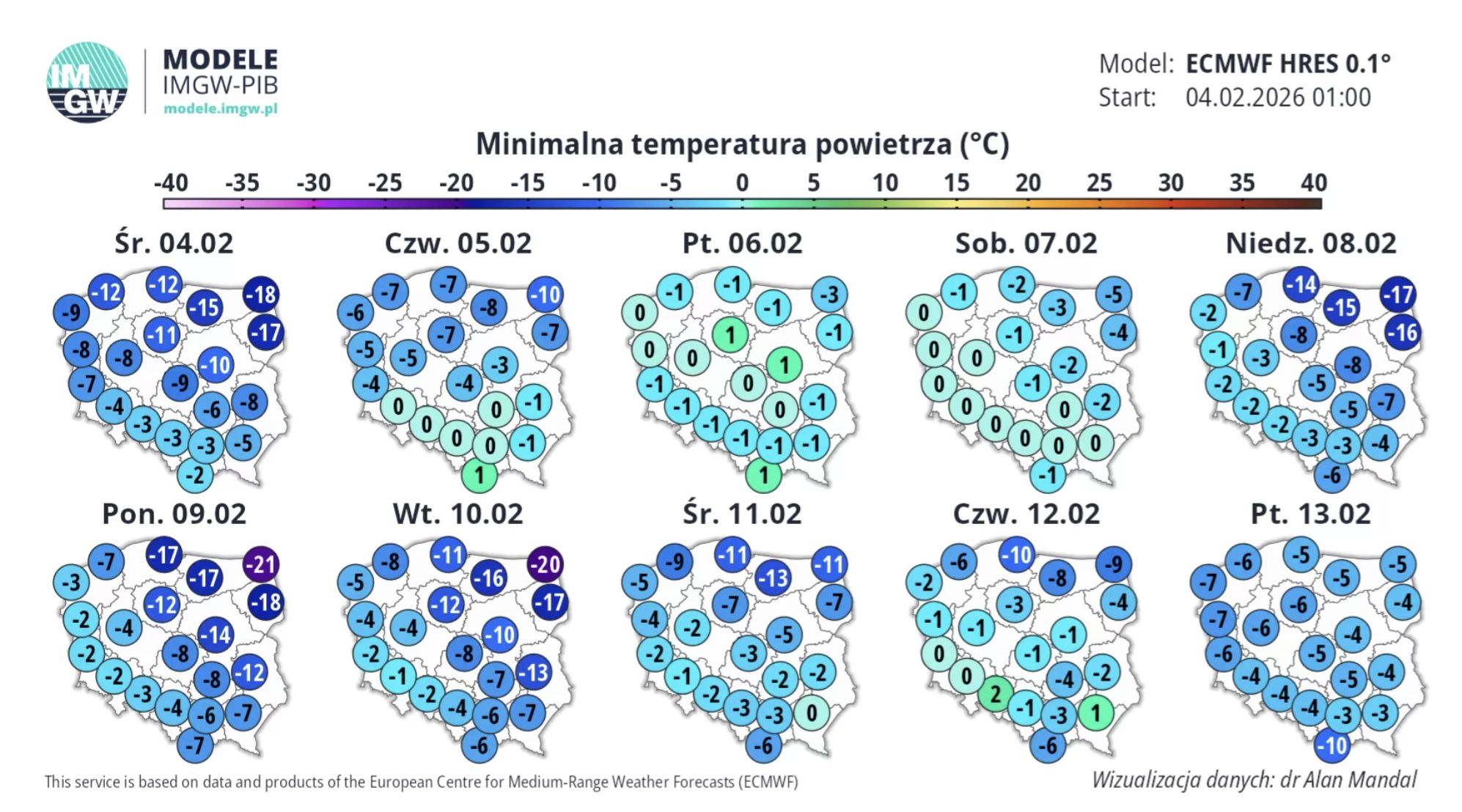 Poniedziałek (9 lutego) i wtorek (10 lutego) przyniosą apogeum drugiej fali mrozów. Modele ECMWF są bezlitosne - w nocy z poniedziałku na wtorek wschodnia ściana Polski znów pokryje się fioletem.
