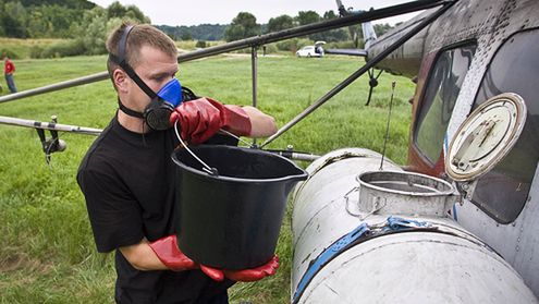 Przygotowania do lotu z preparatem przeciwko komarom.