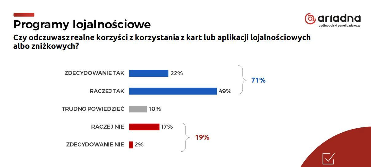 Aż 71 proc. z nich stwierdziło, że odczuwa korzyści z używania kart lojalnościowych w sklepach ("zdecydowanie tak" - 22 proc.; "raczej tak" - 49 proc.). Przeciwnego zdania było 19 proc. respondentów, którzy nie dostrzegają, by płynęły z tego jakieś profity ("zdecydowanie nie" - 2 proc.; "raczej nie" - 17 proc.). 10 proc. ankietowanych nie miało zdania w tej sprawie.